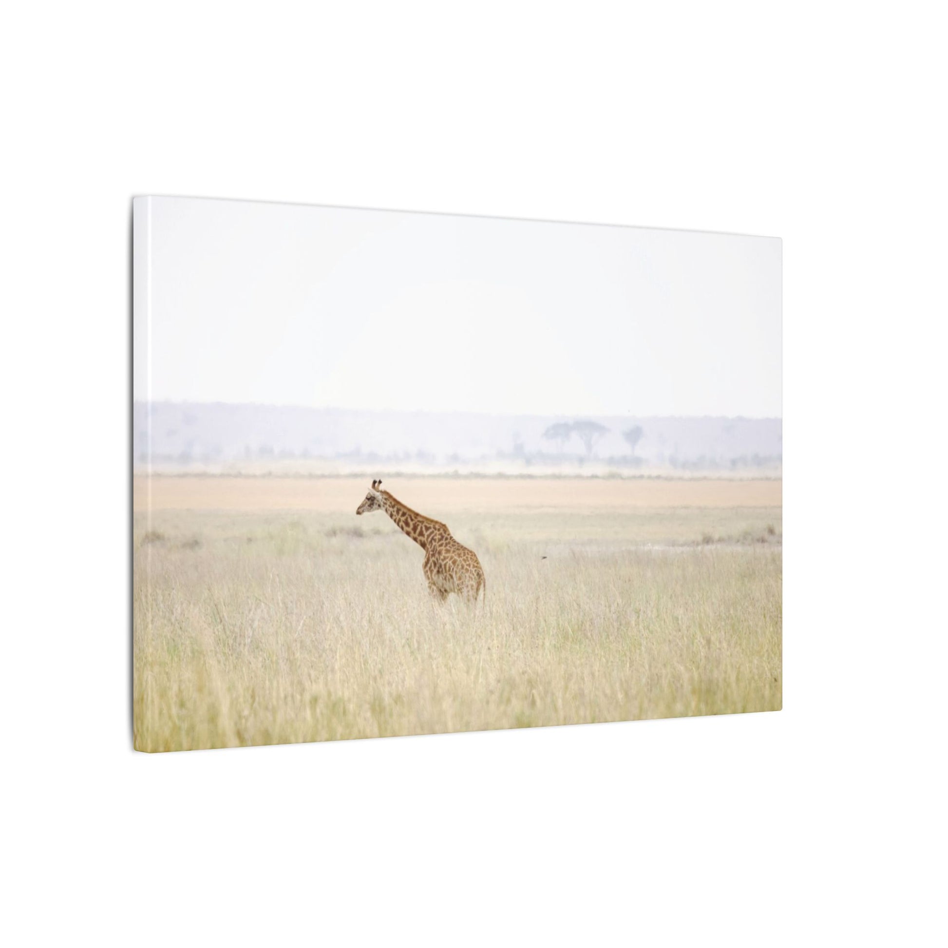 Add a touch of natural elegance to your space with this 12x18 framed canvas by wildlife photographer Mary Korff. Captured on safari, the image features a solitary giraffe strolling through the golden savanna—calm, graceful, and iconic.