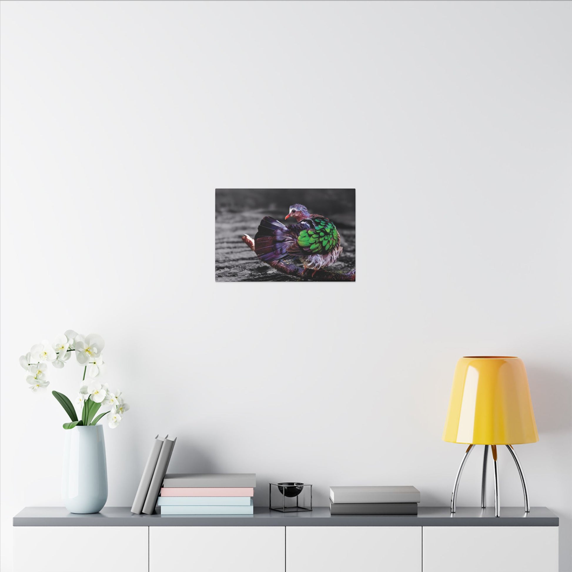 Mary Korff’s expert use of contrast brings the emerald dove to life—its rich hues standing out beautifully against the soft, black-and-white surroundings. Ideal for bird lovers, modern interiors, or as a one-of-a-kind gift, this canvas blends nature and artistry in perfect balance.